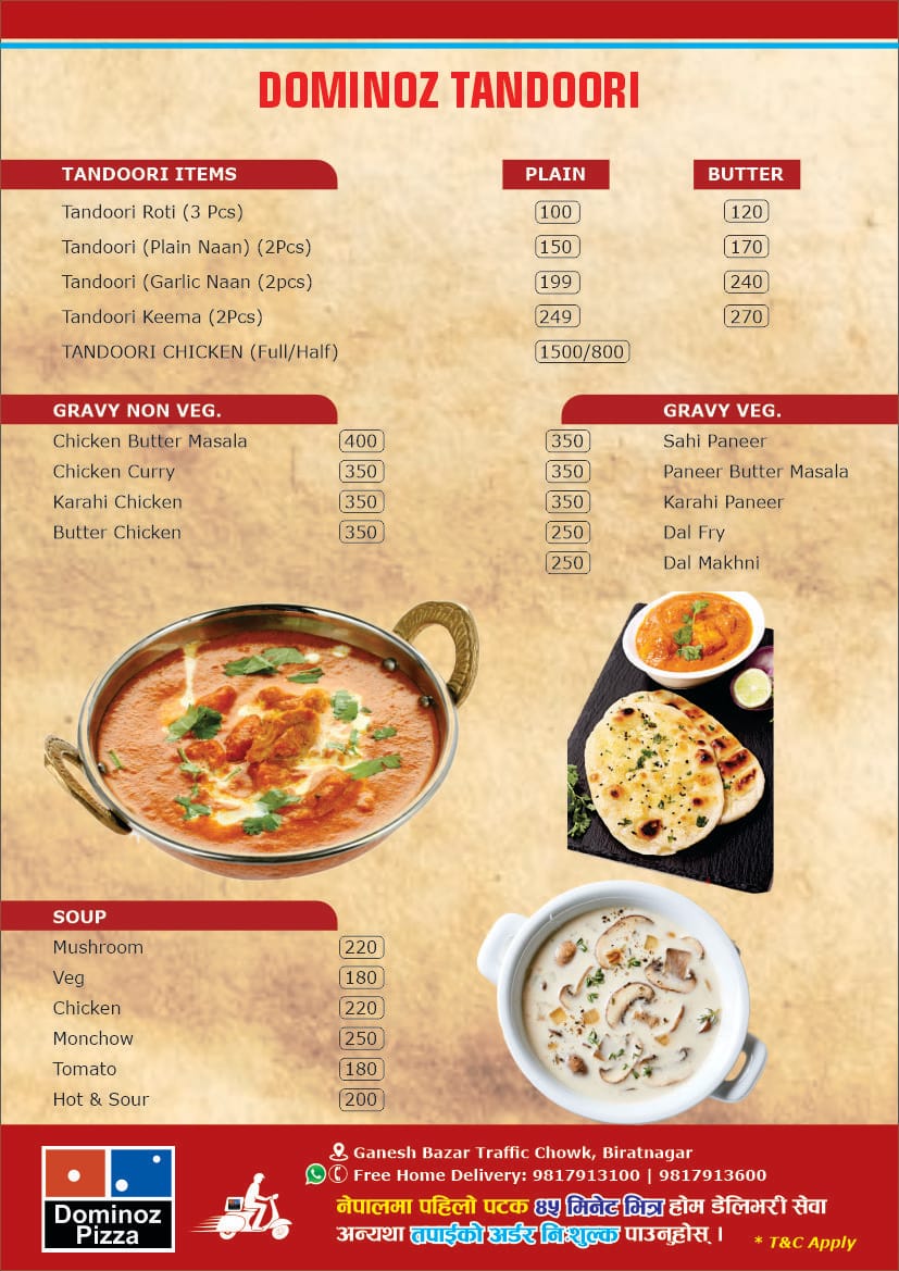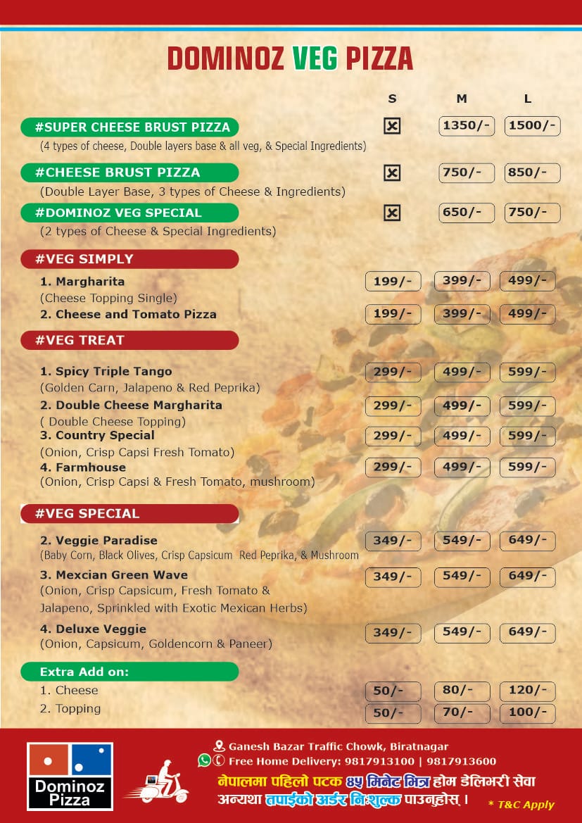 - Dominoz Pizza is one of the best pizza outlet in Biratnagar, Nepal. It has more items like: